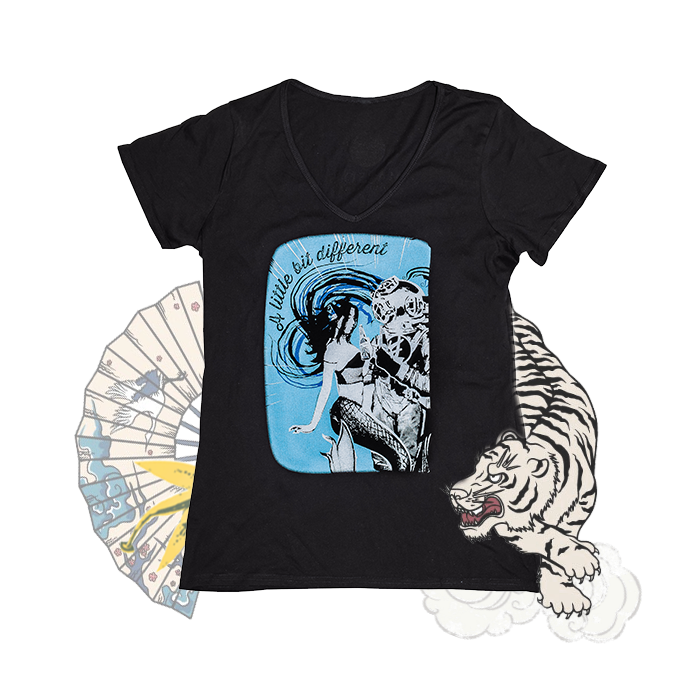 Black v-neck t-shirt with Mermaid and diver print on it.